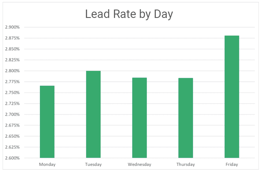 The effect of the day alone on lead rates – as with open rates – is absolutely minimal, with just 4% variance from day to day.